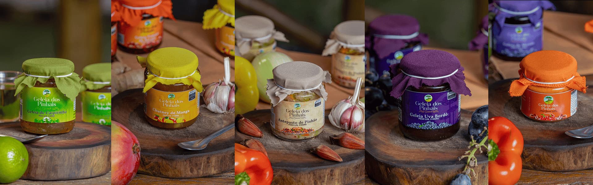 Mais de 50 sabores entre geleias(gelées,confitures),chutneys, pestos,antepastos — todos desenvolvidos com o compromisso de entregar o verdadeiro gosto da fruta, do campo, da cozinha feita com carinho.